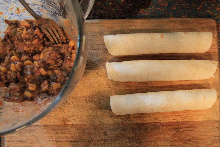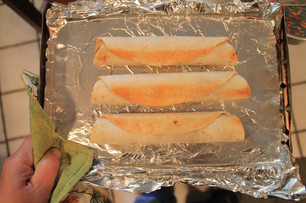 - Carefully roll up the tortilla around the filling, starting at the edge closest to the filling. Very Important: Tuck that edge underneath the filling and then continue rolling until you have a tight cigar shape. Place taquito on the baking sheet, seam side down and repeat the process with the remaining tortillas and filling.