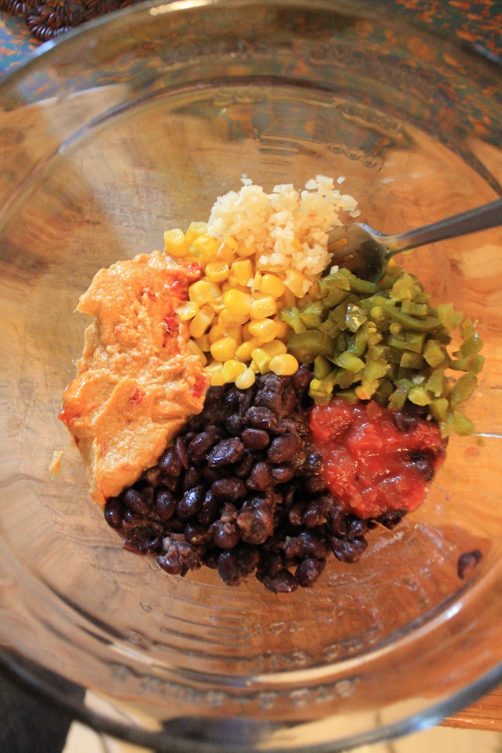 - Add the corn, hummus, garlic, jalapenos and salsa and mix until completely combined.