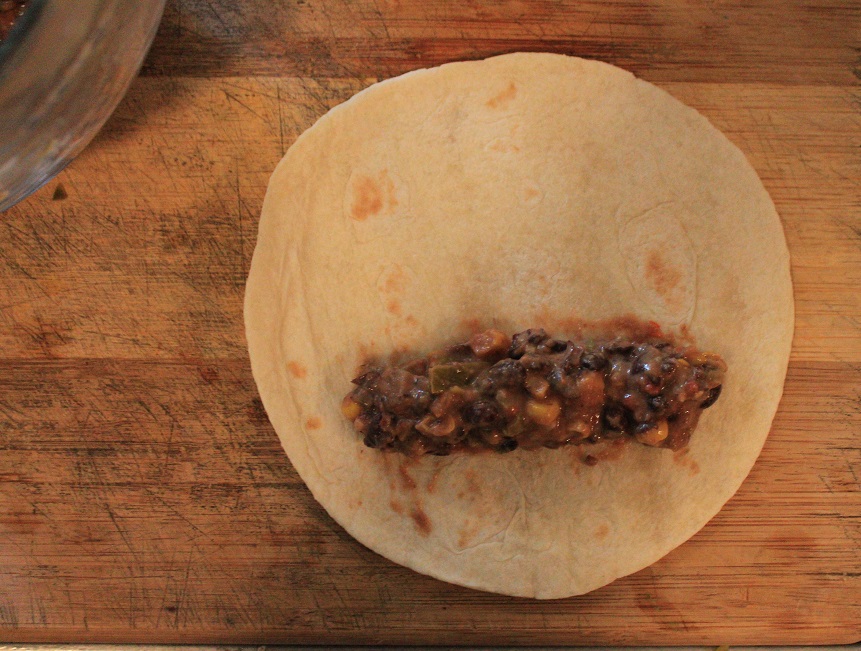 - Lay out one tortilla and scoop 1 1/2 tablespoons of mixture about 1" from the edge (it doesn't look like much filling, but believe me, if you do more it'll explode out the ends when you bake them. Ask me how I know that, lol!).