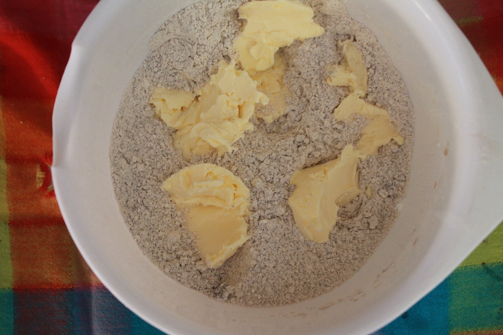 - Add the cold non dairy butter and work into the flour, using a pastry blender or forks, until the butter is in pea size pieces.