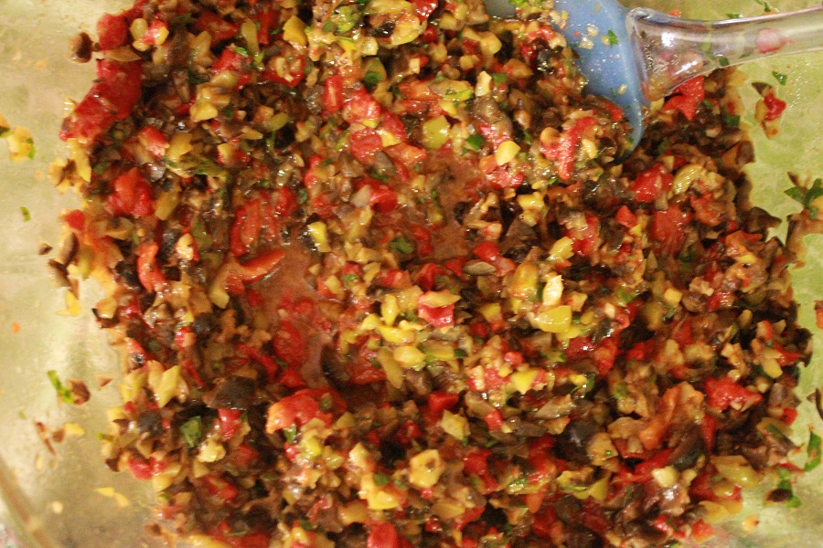 - Add the vinegar, olive oil, garlic, parsley, lemon juice and salt and pepper to taste to olives and peppers. Mix until very well combined.