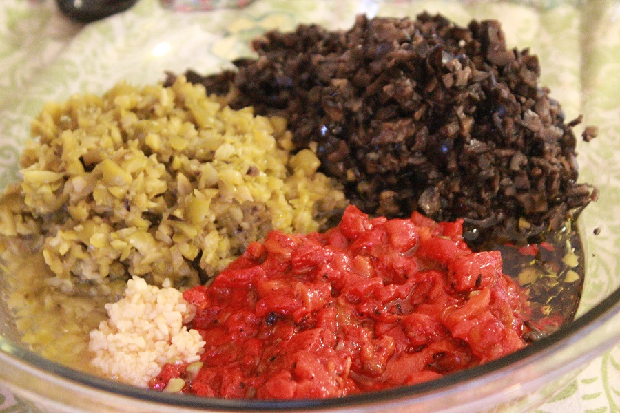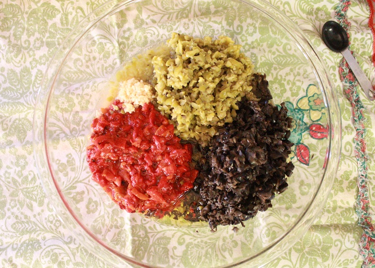 - In a food processor, pulse the olives until roughly chopped. You can do them all at once if your processor is big enough or do it in batches. Then move them to large bowl.