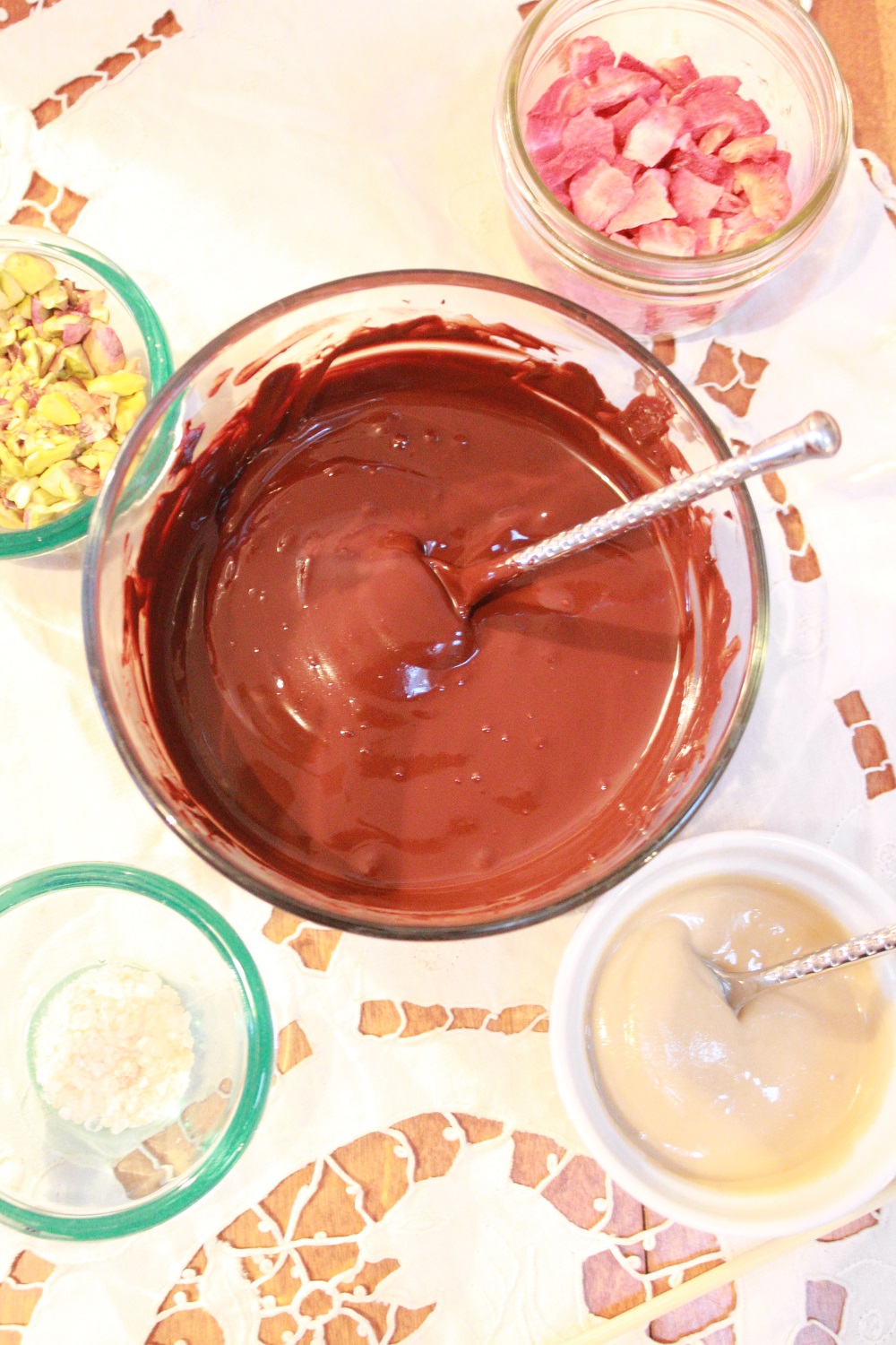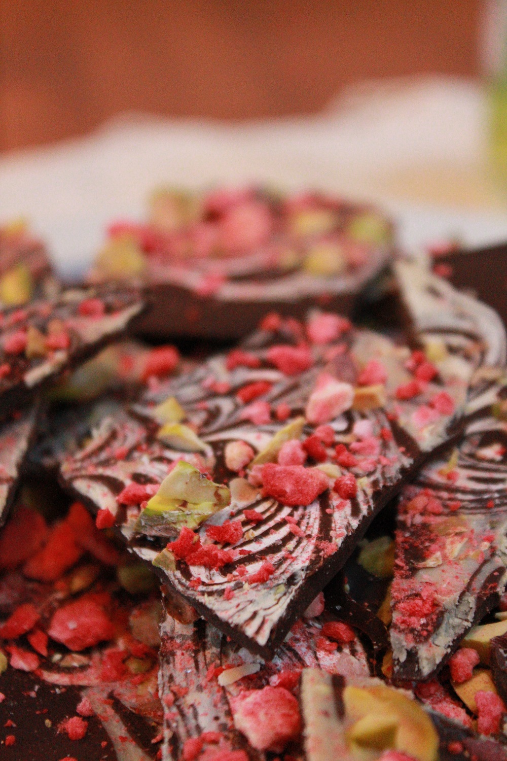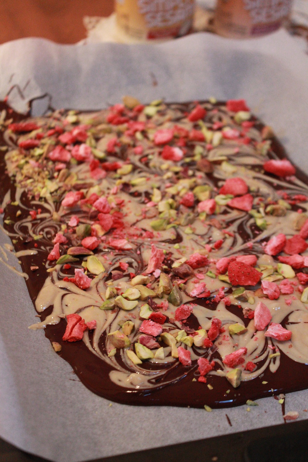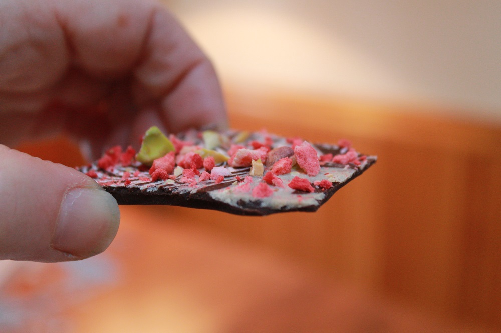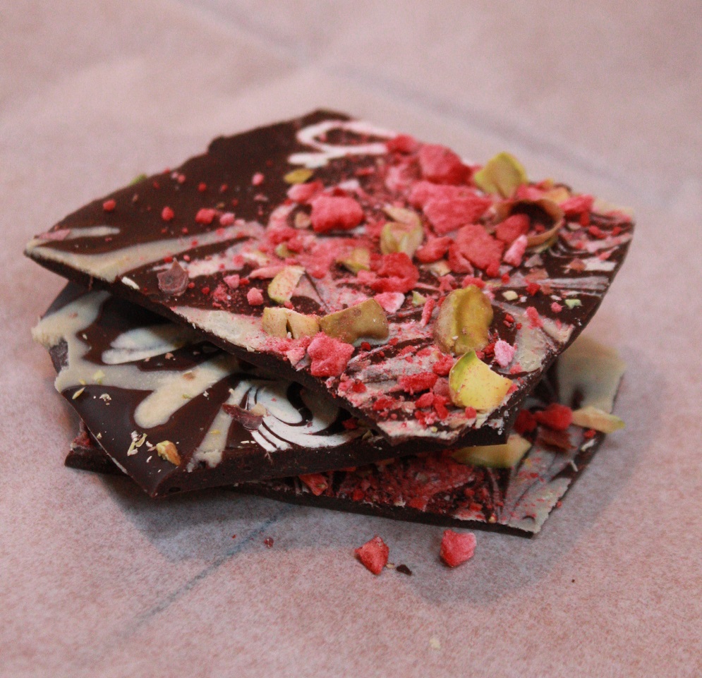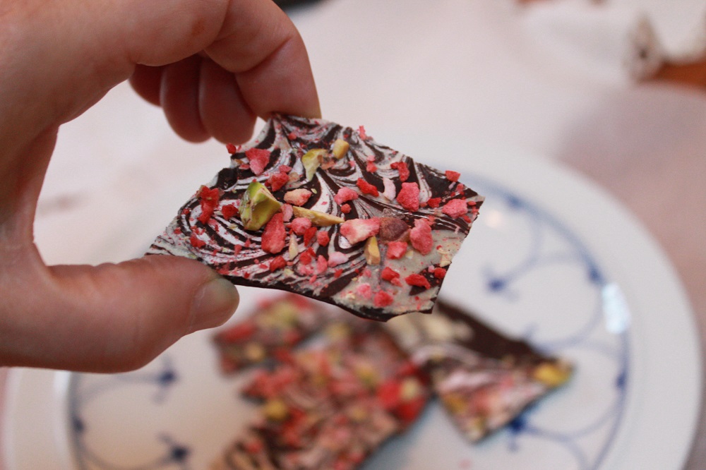 The melted dark chocolate is swirled with Simply Sesame Pistachio Spread, sprinkled with chopped pistachios, bits of freeze dried strawberries and a dash or two of sea salt. It’s an amazing combo, the sweetness of the fruit with the richness of the nuts and sesame pistachio spread. Plus, it looks like you’ve spent hours working on a masterpiece, when in reality it just takes a few minutes to assemble, then a few hours to set (but let everyone think it took ridiculous effort…soak up the adoration and praise…you’re worth it!).
