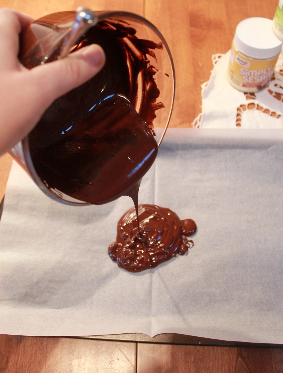- Drip ribbons of the Simply Sesame Pistachio Spread across the chocolate. I used a teaspoon and let it drop off the spoon.