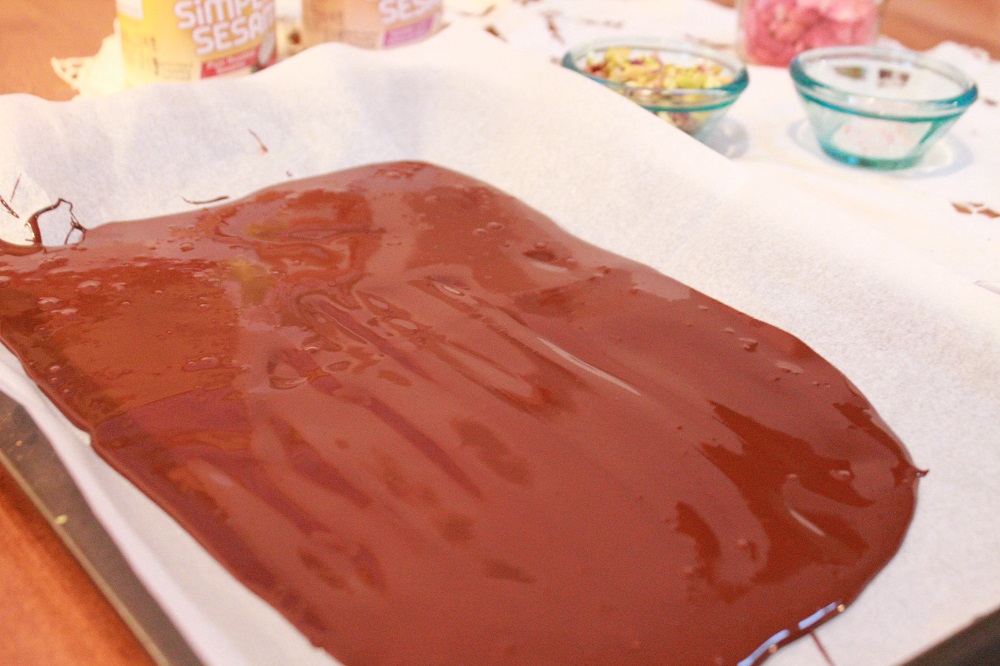 - Pour the melted chocolate onto your prepared baking sheet and spread gently with a spatula until it is even across the pan. You can decide how thick or thin you want the bark to be.