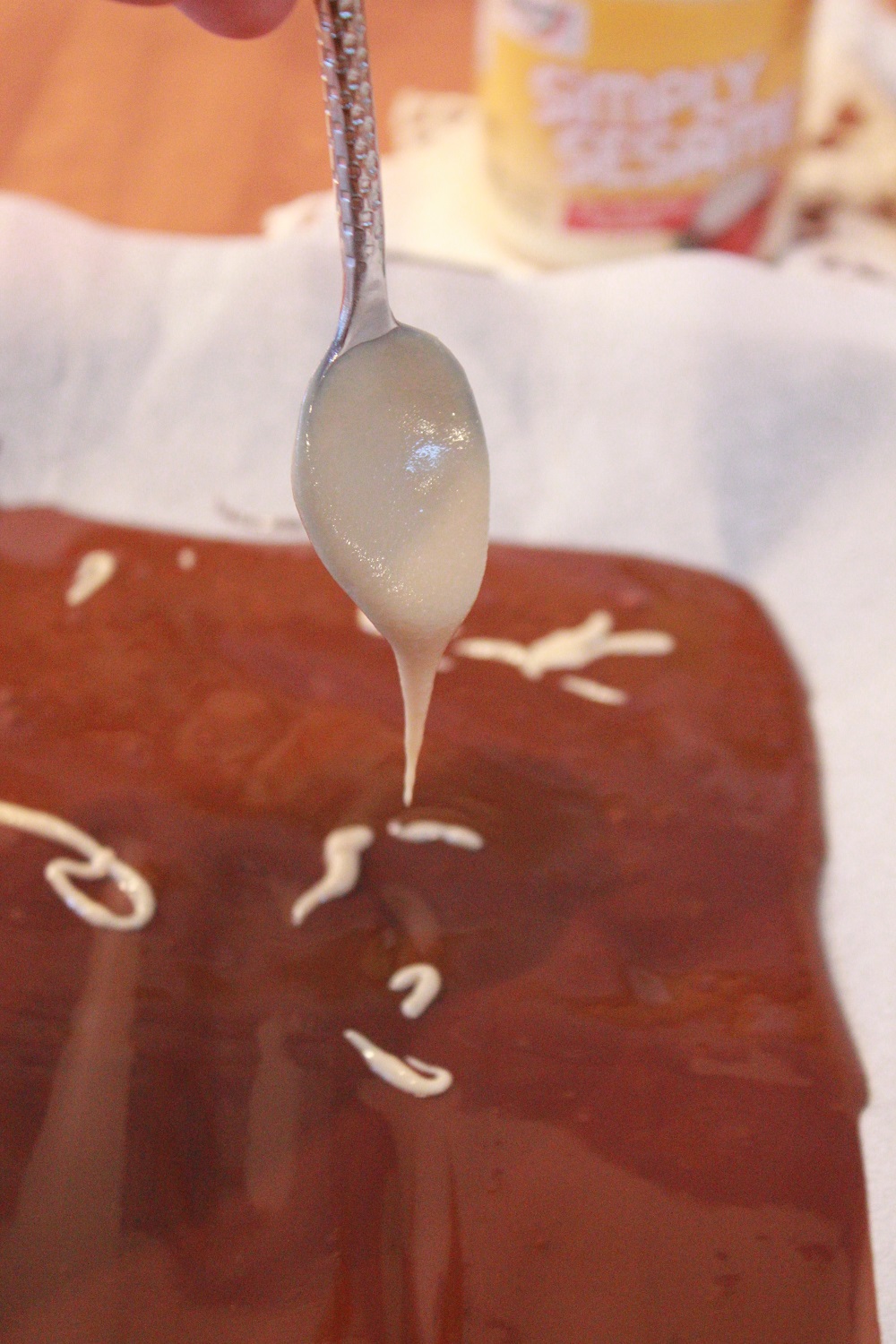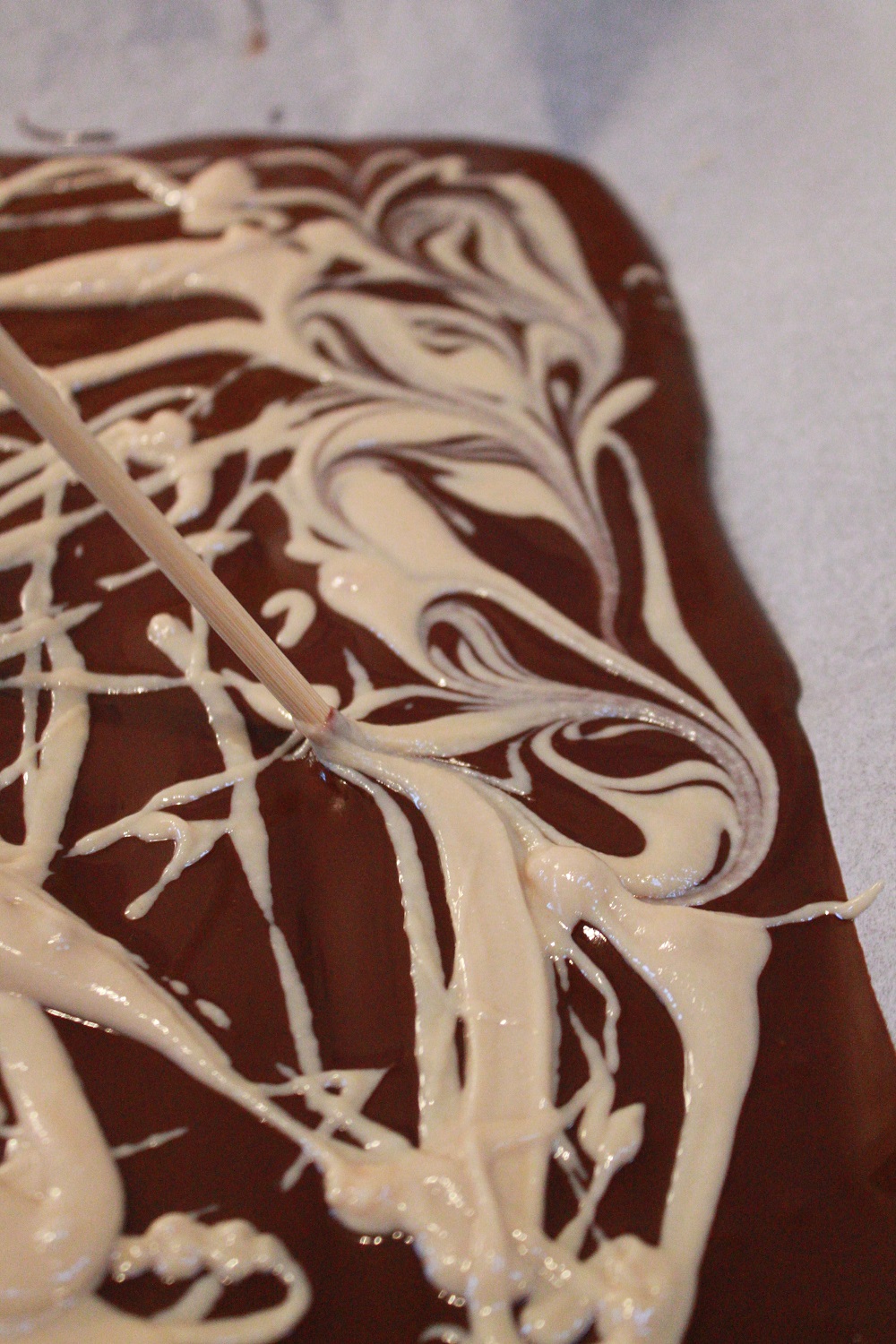 - Using a toothpick, chopstick or skewer of some sort, swirl the Sesame Spread around in the chocolate. I find making small figure eights with a skewer makes a really nice swirly pattern.