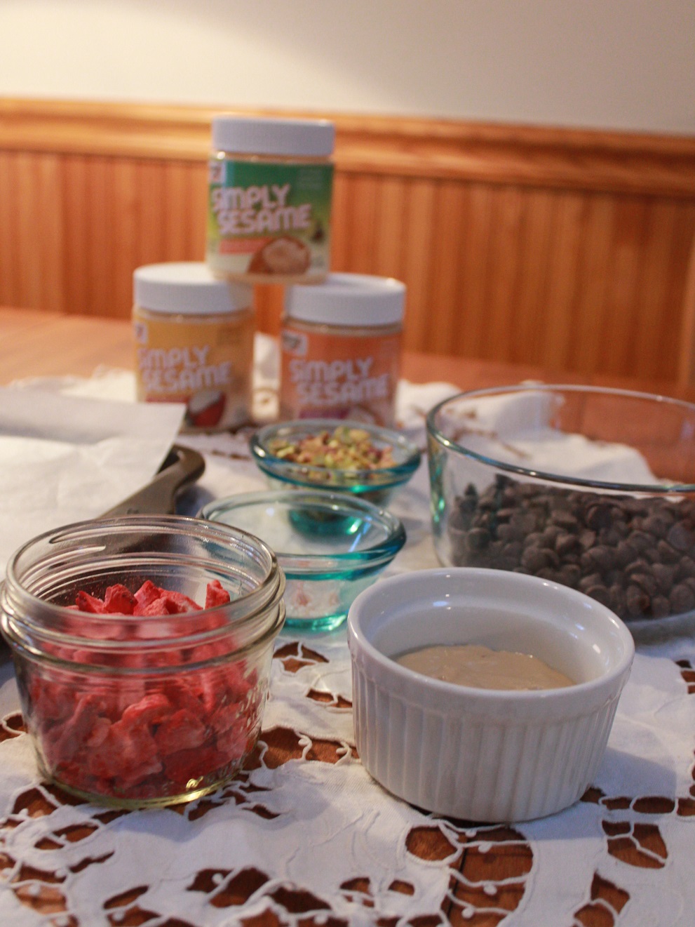 Besides using these spreads in recipes, I’ve been putting them on toast as an alternative to peanut butter and dipping fruit in it. The Vanilla with Almond Bits is delicious on bananas! All the Simply Sesame spreads are made without preservatives, are gluten-free, peanut free, palm oil free, non-gmo and vegan. Pretty awesome!
