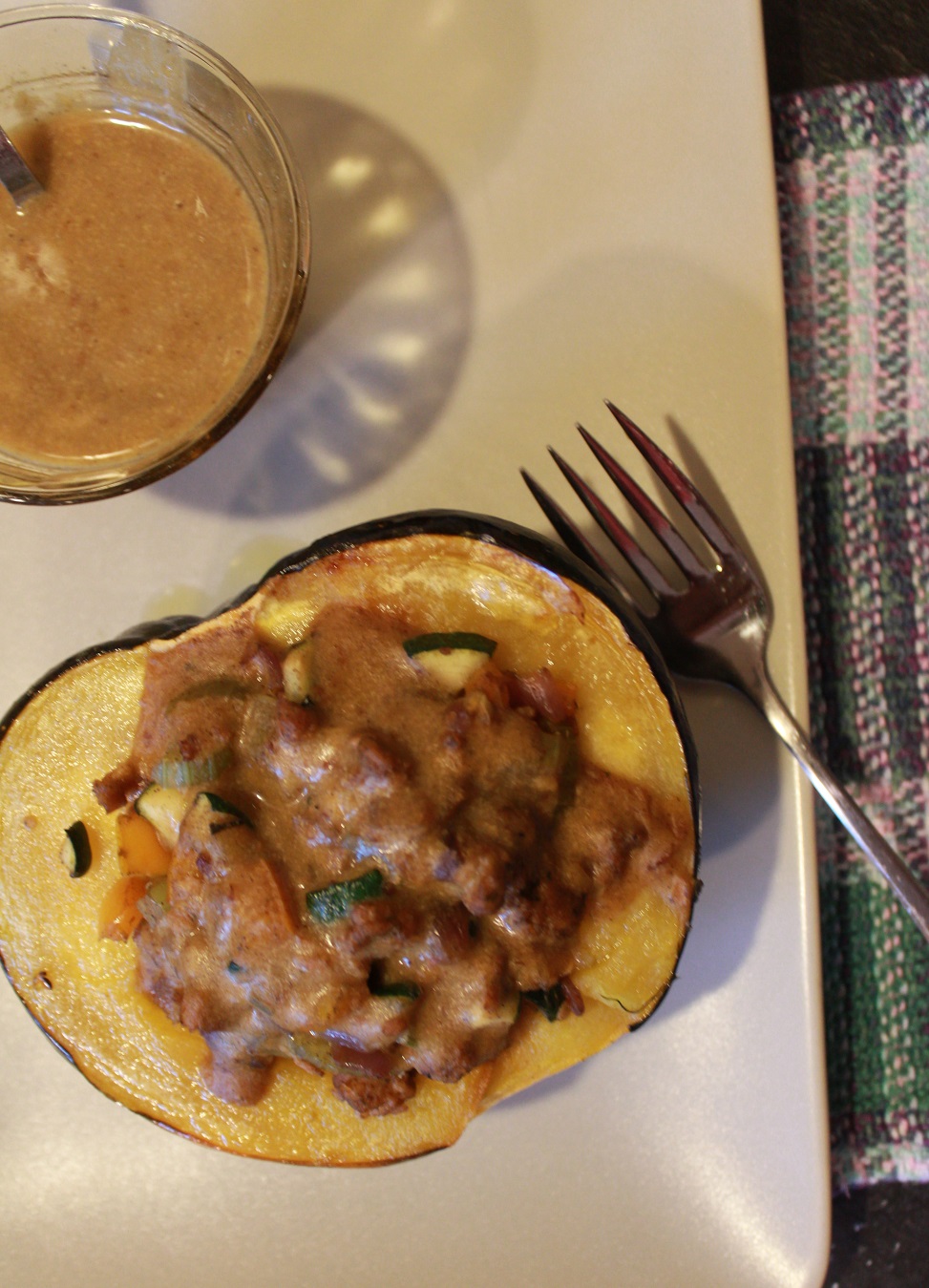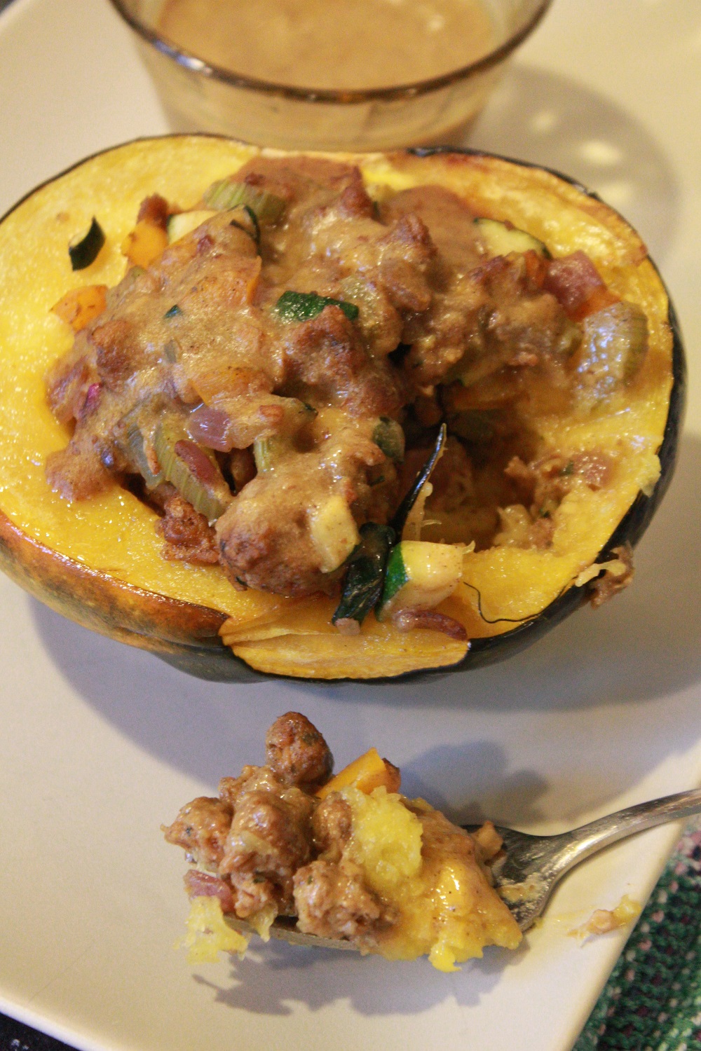 - Carefully turn squash over. Fill each cavity heaping with stuffing. Drizzle with 2 tablespoons of gravy.