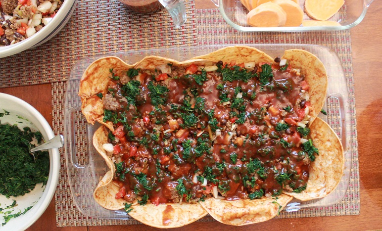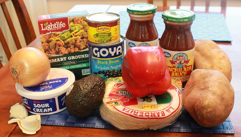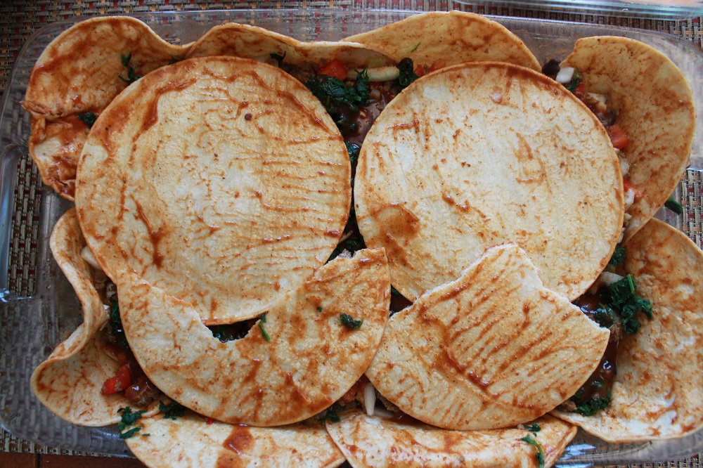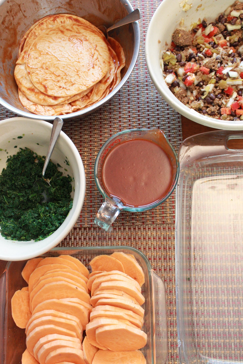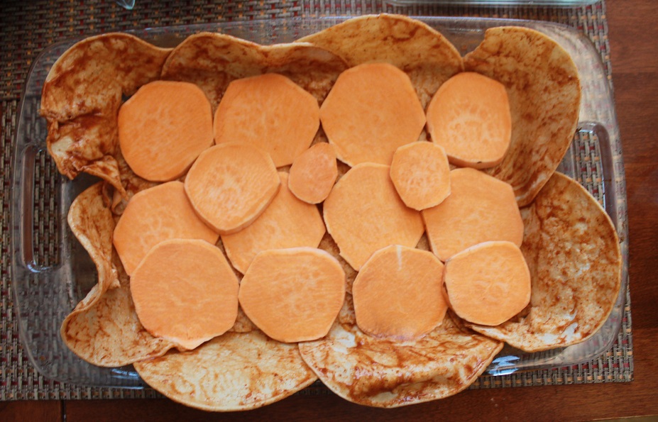 - Assembly: Arrange 10 of the tortillas in the bottom of the casserole dish. Place a single layer of sweet potatoes on top of the tortillas. Arrange 1/2 the veggie crumble mixture on top, then 1/2 the spinach mixture. Spread 2/3 cup enchilada sauce on top. Arrange 3 more tortillas on top, tearing them if needed to fit.