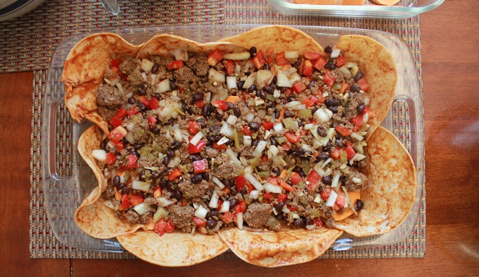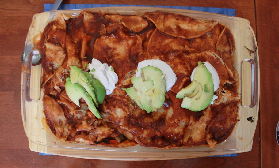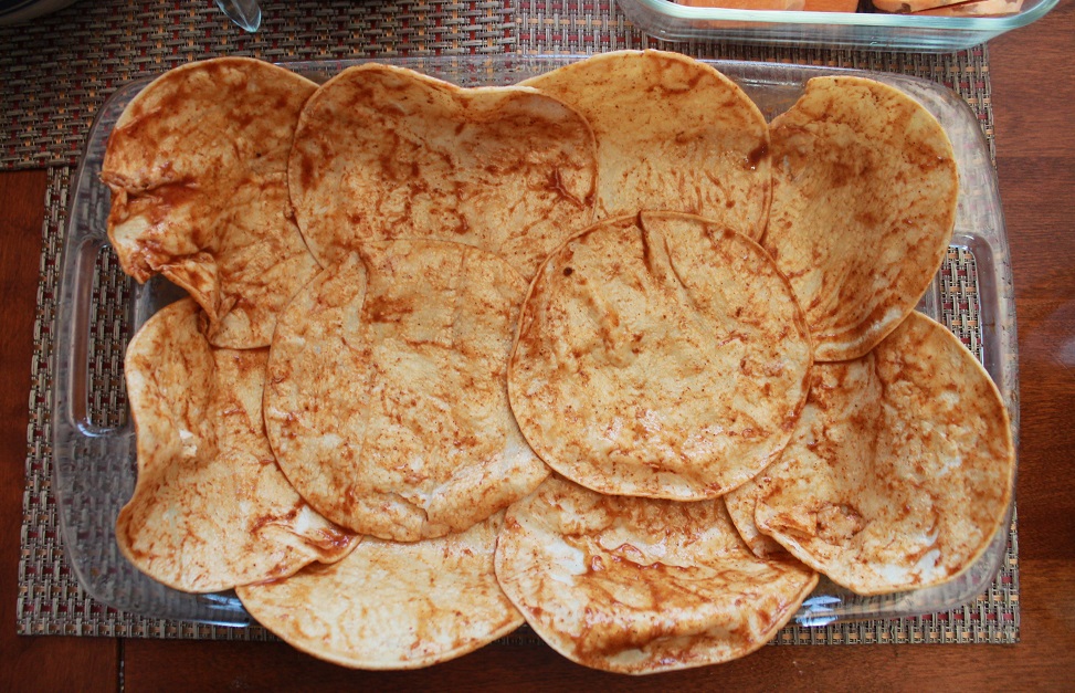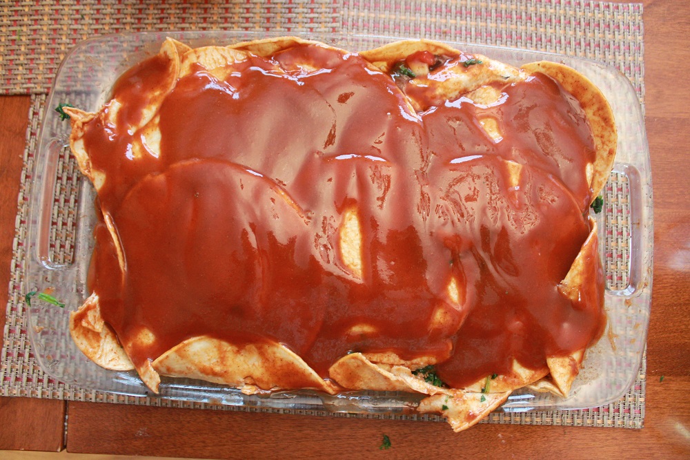 - Repeat the layers, ending with the remainder of the torillas covering the top and covered with the remainder of the enchilada sauce.