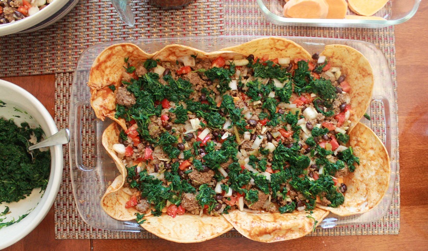Corn tortillas are soaked in enchilada sauce and used to line the pan. Then layers of sweet potatoes, veggie crumbles, spinach and more enchilada sauce are added until you have a casserole dish you can barely lift off the table. Oh yeah, it’s a good workout too!
