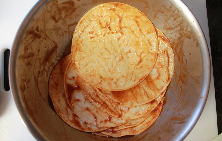 - In a medium bowl, combine the corn tortillas and 3/4 cup of the enchilada sauce. Flip around the tortillas until they are coated in sauce. This can also be done (gently) in a plastic bag. Set aside.
