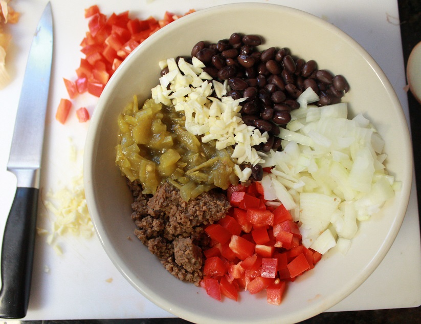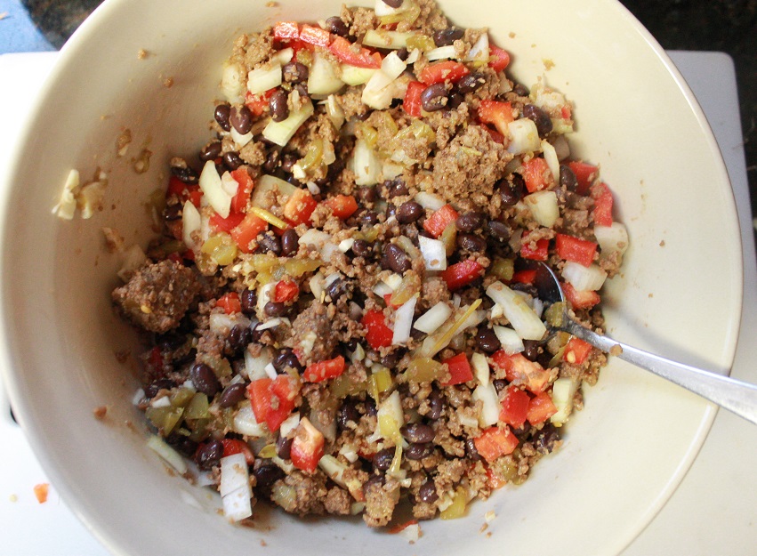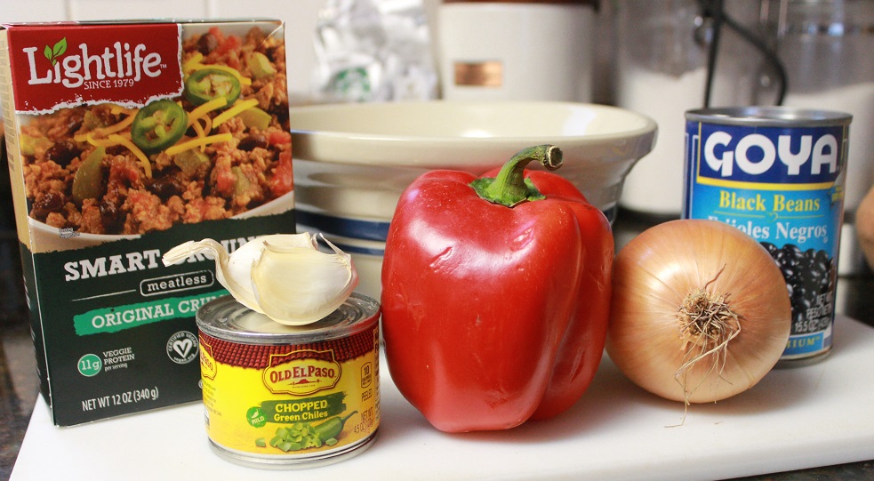 - Add the meatless crumbles to a large bowl, breaking them up as best as possible if there are clumps. Dice the red pepper and onion and add them in. Add the drained and rinsed black beans and the green chilis and then mix the whole thing together until thoroughly combined. Set aside.