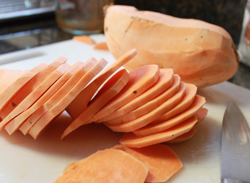 - Slice the sweet potato in 1/4 inch slices. Set aside.